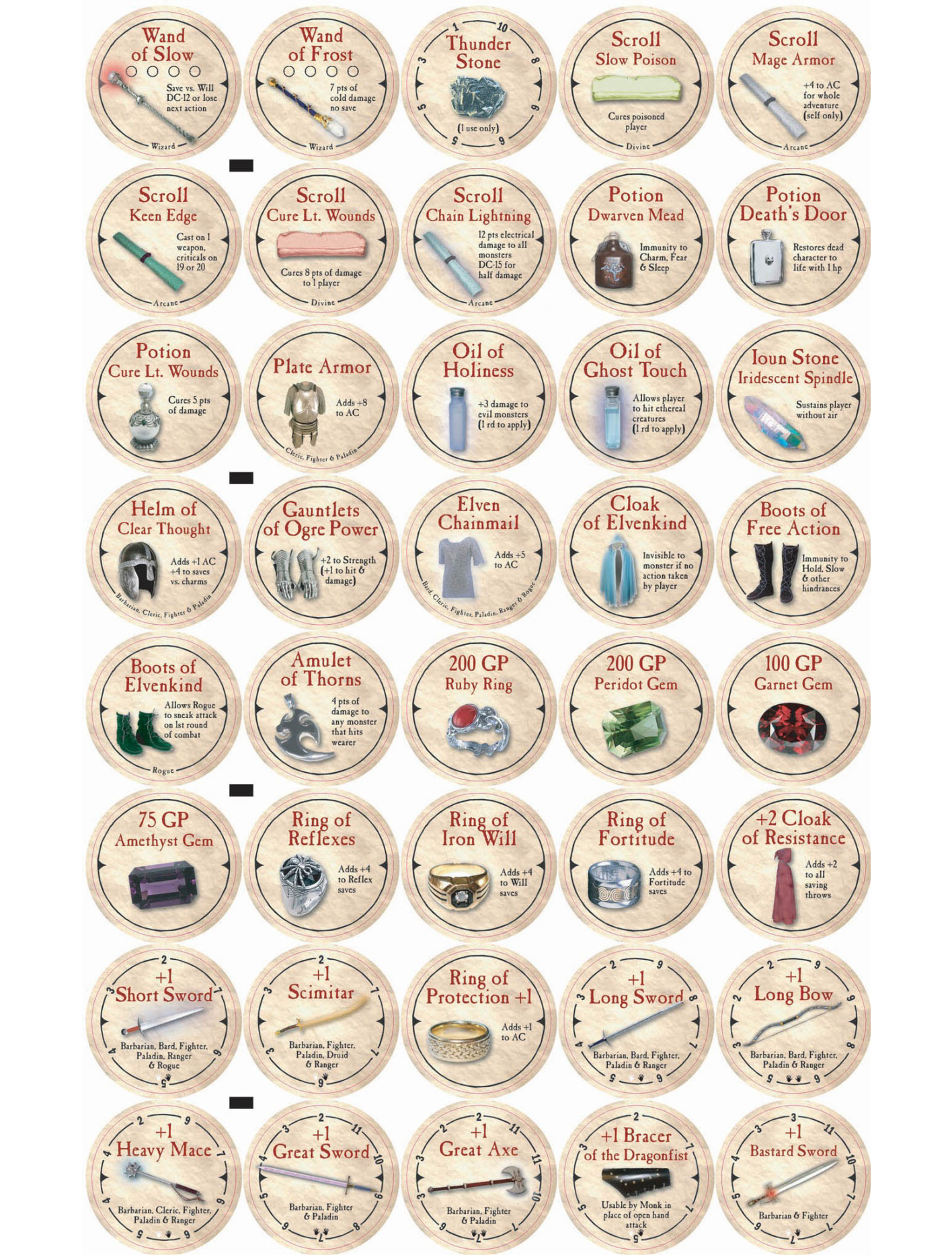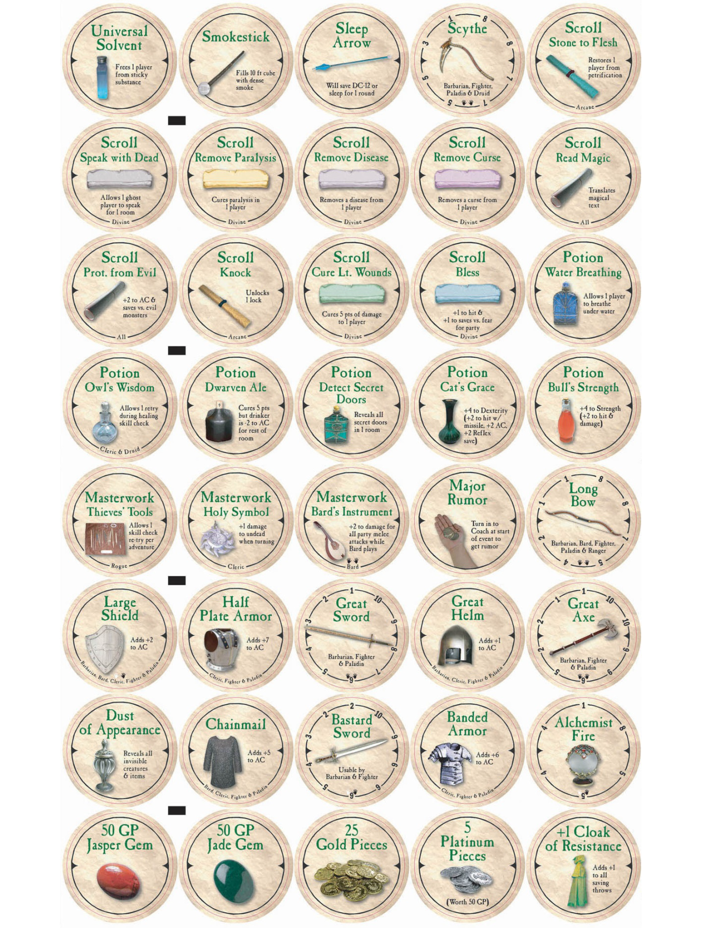 This is a complete set of all 120 Standard Pack Gold 2007 True Dungeon tokens. It includes the Gold version of all 40 Common, 40 Uncommon, and 40 Rare tokens!