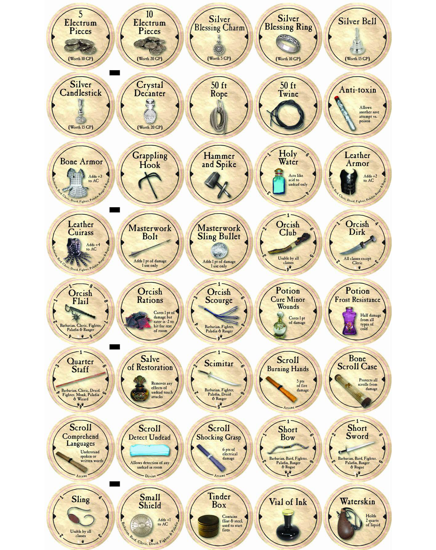 This is a complete set of all 120 Standard Pack Gold 2008 True Dungeon tokens. It includes the Gold version of all 40 Common, 40 Uncommon, and 40 Rare tokens!