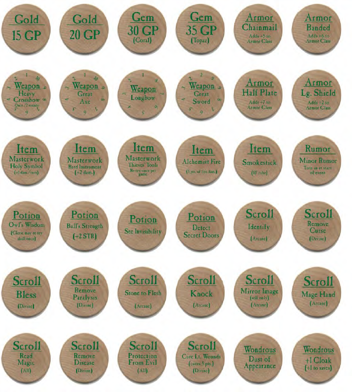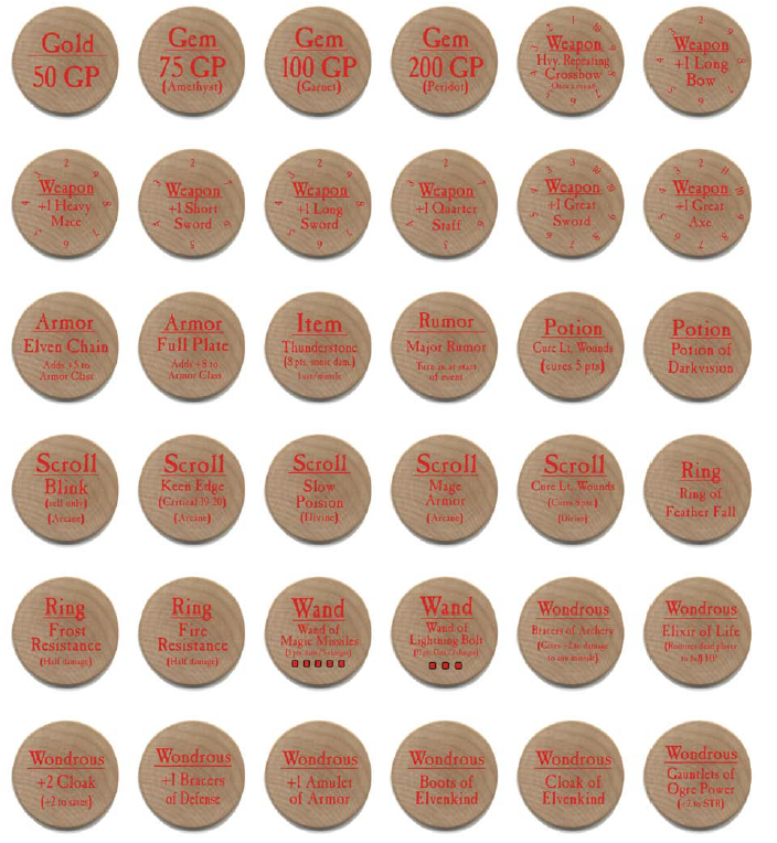 This is a complete set of all 108 Standard Pack C/UC/R Wooden 2006 True Dungeon tokens. It includes the Wooden version of all 36 Common, 36 Uncommon, and 36 Rare tokens!