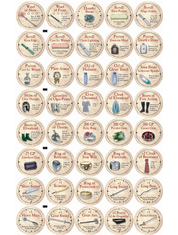 This is a complete set of all 120 Standard Pack Gold 2007 True Dungeon tokens. It includes the Gold version of all 40 Common, 40 Uncommon, and 40 Rare tokens!